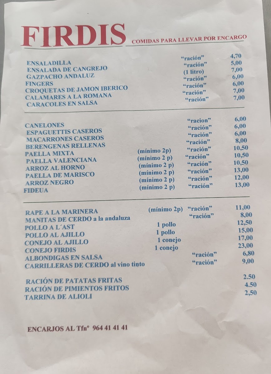 Welcome to FIRDIS comidas para llevar, your go-to Mediterranean restaurant located in the heart of Alcossebre, Spain. Known for its delightful selection of takeout dishes, FIRDIS excels in crafting authentic paellas that stand out for their flavor and generous portions. Customers rave about the seafood and paella valenciana, which showcase perfectly cooked grains and vibrant flavors that transport diners to the Mediterranean coast.